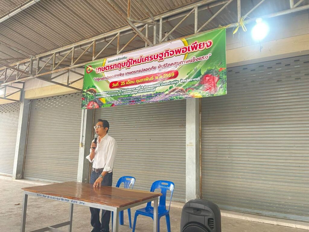 วันที่ 25 กุมภาพันธ์ 2569 นายพิเชษฐ ตุ้มมล เกษตรอำเภอบ้านโป่ง มอบหมายให้นายคมสัน สิงห์โต นักวิชาการส่งเสริมการเกษตร เป็นวิทยากรให้ความรู้กับผู้เข้ารับการอบรมตามโครงการส่งเสริมเกษตรทฤษฎีใหม่ เศรษฐกิจพอเพียง “ปลูกผักปลอดสารพิษ เกษตรกรปลอดภัย ผู้บริโภคสุขภาพแข็งแรง” ภายใต้หลักเศรษฐกิจพอเพียง สามารถพึ่งตนเองอย่างยั่งยืนและเป็นการน้อมนำแนวทางตามพระราชดำริไปเป็นกรอบแนวทางประยุกต์ให้สอดคล้องกับตนเอง ณ ศาลาวัดตาผา หมู่ที่ 8 ตำบลนครชุมน์ อำเภอบ้านโป่ง จังหวัดราชบุรี