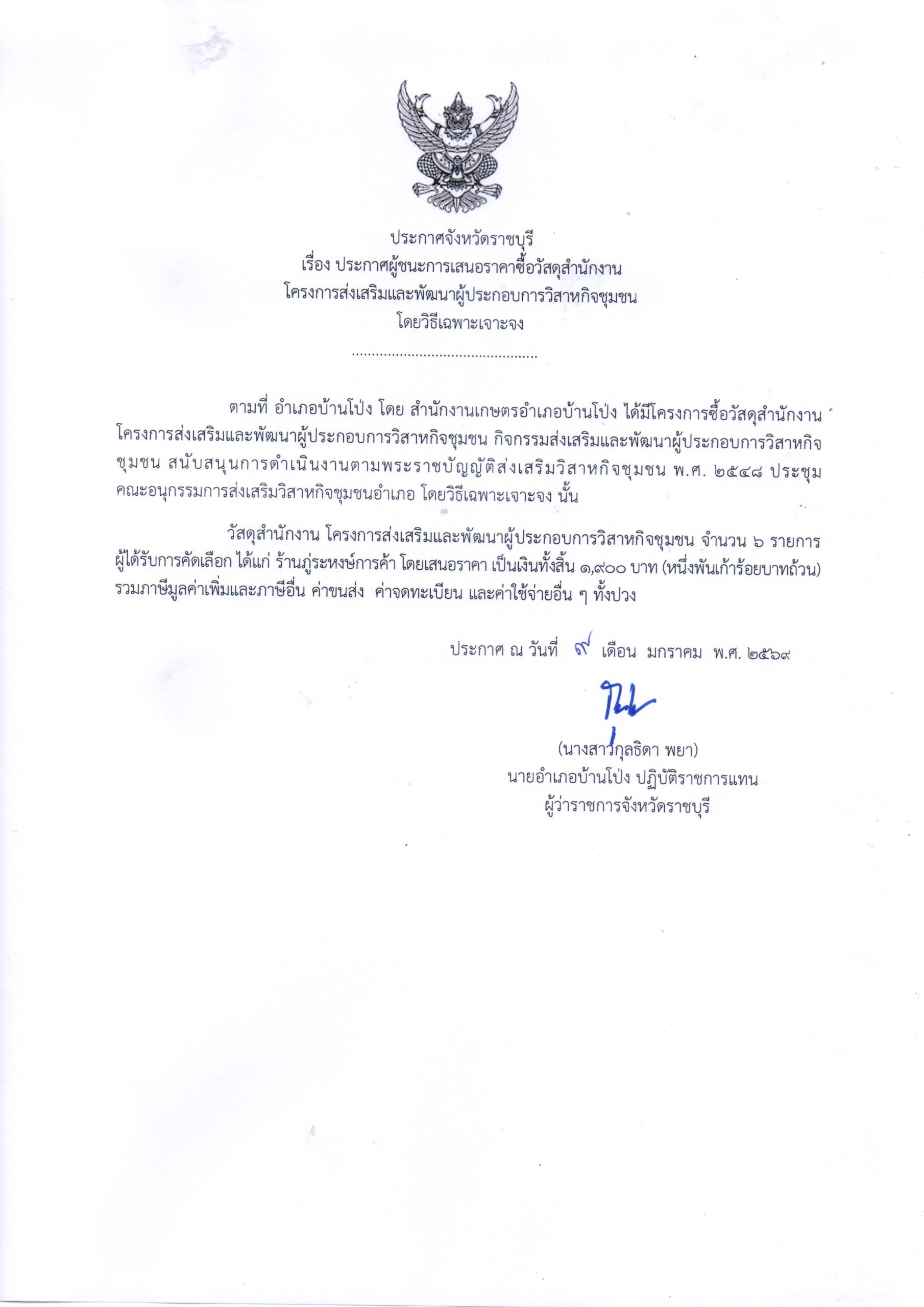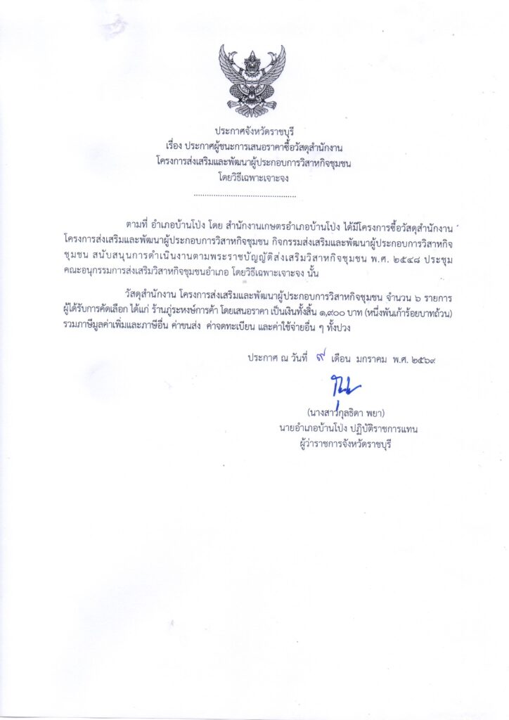 ประกาศผู้ชนะการเสนอราคาซื้อวัสดุสำนักงาน โครงการส่งเสริมและพัฒนาผู้ประกอบการวิสาหกิจชุมชน โดยวิธีเฉพาะเจาะจงBy adminbanpong / 27 กุมภาพันธ์ 2026 13.Prakad R Purahoung1900ดาวน์โหลด