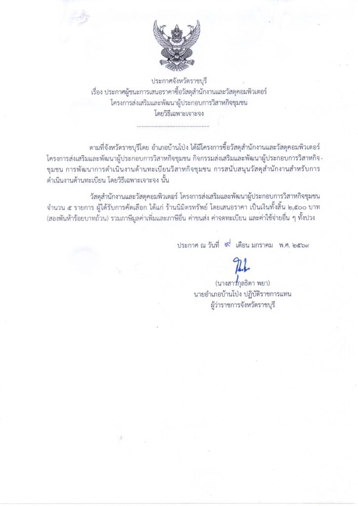 ประกาศผู้ชนะการเสนอราคาซื้อวัสดุสำนักงานและวัสดุคอมพิวเตอร์ โครงการส่งเสริมและพัฒนาผู้ประกอบการวิสาหกิจชุมชน โดยวิธีเฉพาะเจาะจงBy adminbanpong / 27 กุมภาพันธ์ 2026