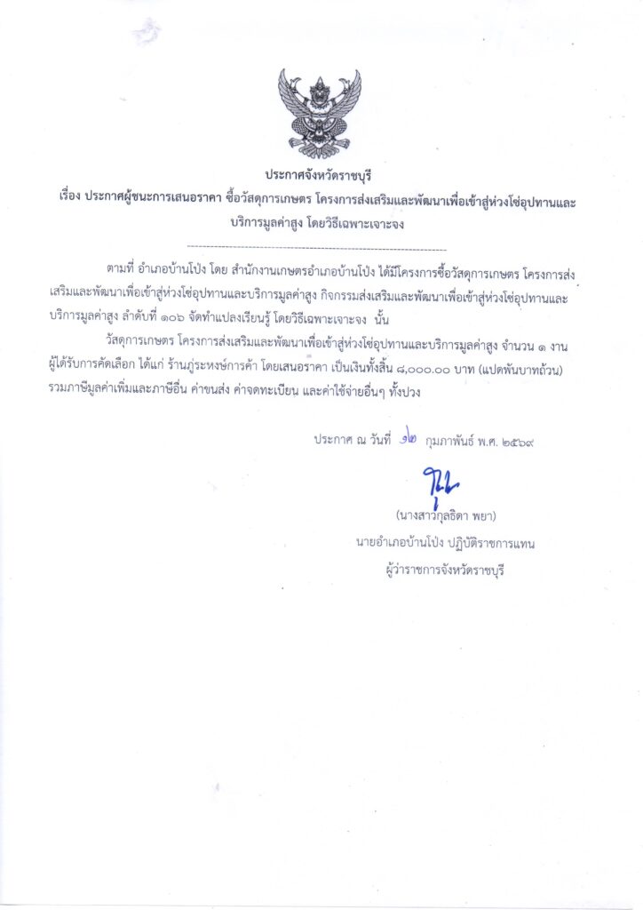 ประกาศผู้ชนะการเสนอราคาซื้อวัสดุการเกษตร โครงการส่งเสริมและพัฒนาเพื่อเข้าสู่ห่วงโซ่อุปทานและบริการมูลค่าสูง โดยวิธีเฉพาะเจาะจงBy adminbanpong / 27 กุมภาพันธ์ 2026