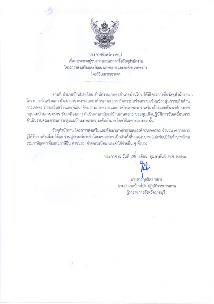 ประกาศผู้ชนะการเสนอราคาซื้อวัสดุสำนักงาน โครงการส่งเสริมและพัฒนาเกษตรกรและองค์กรเกษตรกร โดยวิธีเฉพาะเจาะจงBy adminbanpong / 2 มีนาคม 2026