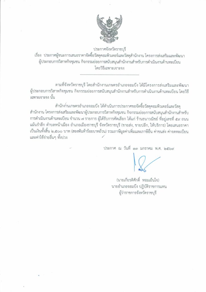 ประกาศผู้ชนะการเสนอราคาจัดซื้อวัสดุคอมพิวเตอร์และวัสดุสำนักงาน โครงการส่งเสริมและพัฒนาผู้ประกอบการวิสาหกิจชุมชน กิจกรรมย่อยการสนับสนุนสำนักงานสำหรับการดำเนินงานด้านทะเบียน โดยวิธีเฉพาะเจาะจงBy adminchombueng / 13 มกราคม 2026