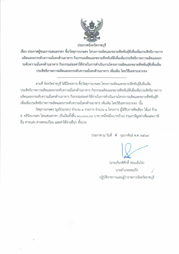 ประกาศผู้ชนะการเสนอราคาซื้อวัสดุการเกษตร โครงการผลิตและขยายพืชพันธุ์ดีเพื่อเพิ่มประสิทธิภาพการผลิตและยกระดับความมั่นคงด้านอาหาร โดยวิธีเฉพาะเจาะจงBy adminchombueng / 4 กุมภาพันธ์ 2026