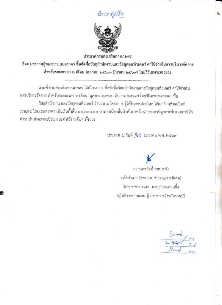 ประกาศผู้ชนะการเสนอราคาจัดซื้อวัสดุสำนักงานและวัสดุคอมพิวเตอร์ ค่าใช้จ่ายในการบริหารจัดการBy adminsuanphueng / 11 กุมภาพันธ์ 2026 ประกาศผู้ชนะการเสนอราคา จัดซื้อวัสดุสำนักงานและวัสดุคอมพิวเตอร์ ค่าใช้จ่ายในการบริหารจัดการ 12 มกราคม 2569
