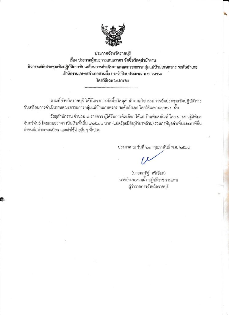 ประกาศผู้ชนะการเสนอราคา จัดซื้อวัสดุสำนักงาน กิจกรรมจัดประชุมเชิงปฏิบัติการขับเคลื่อนการดำเนินงานคณะกรรมการกลุ่มแม่บ้านเกษตรกร ระดับอำเภอBy adminsuanphueng / 26 กุมภาพันธ์ 2026