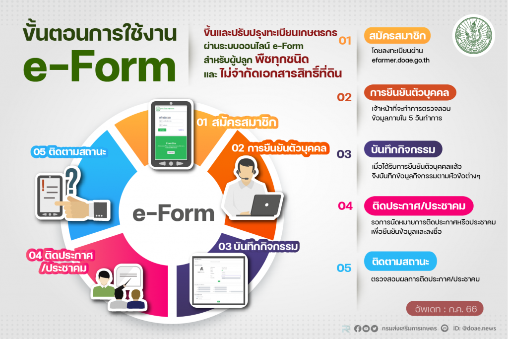 คู่มือบริการประชาชน ขั้นตอนการขึ้นทะเบียนและปรับปรุงทะเบียนเกษตรกรผ่านระบบออนไลน์ E- Form การขึ้นทะเบียนเกษตรกร กรณีแปลงใหม่ การขึ้นทะเบียนเกษตรกร กรณีแปลงเดิม จดทะเบียนวิสาหกิจชุมชนฯ ณ ศูนย์บริการเทคโนโลยีประจำตำบล จดทะเบียนวิสาหกิจชุมชนฯ ณ สำนักงานเกษตรอำเภอฯ